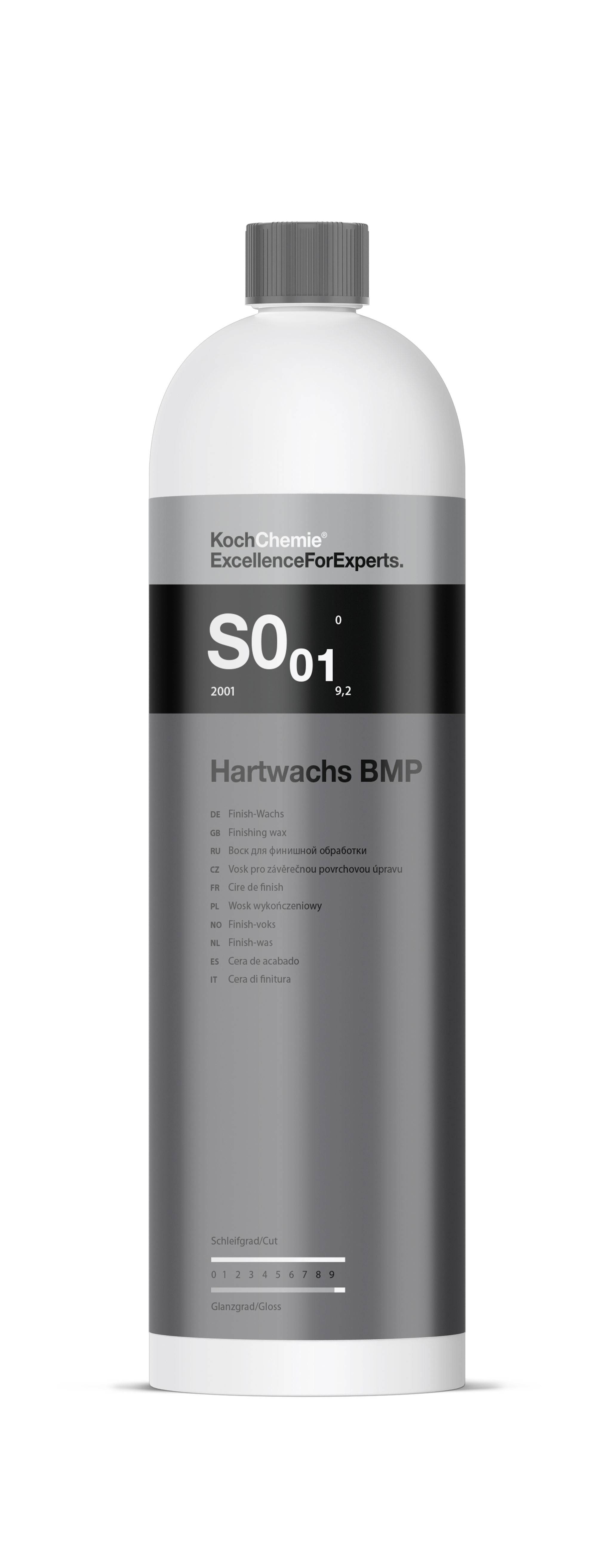 Hartwachs BMP mittels Sprühflasche auf weichen Schwamm auftragen und manuell gleichmäßig dünn auf den Oberflächen verteilen. Alternativ maschinell mittels Exzenter und Finish-Schwamm schwarz verarbeiten. Trocknen lassen und den weiß gewordenen Film mittels Profi-Microfasertuch auf Hochglanz abpolieren.