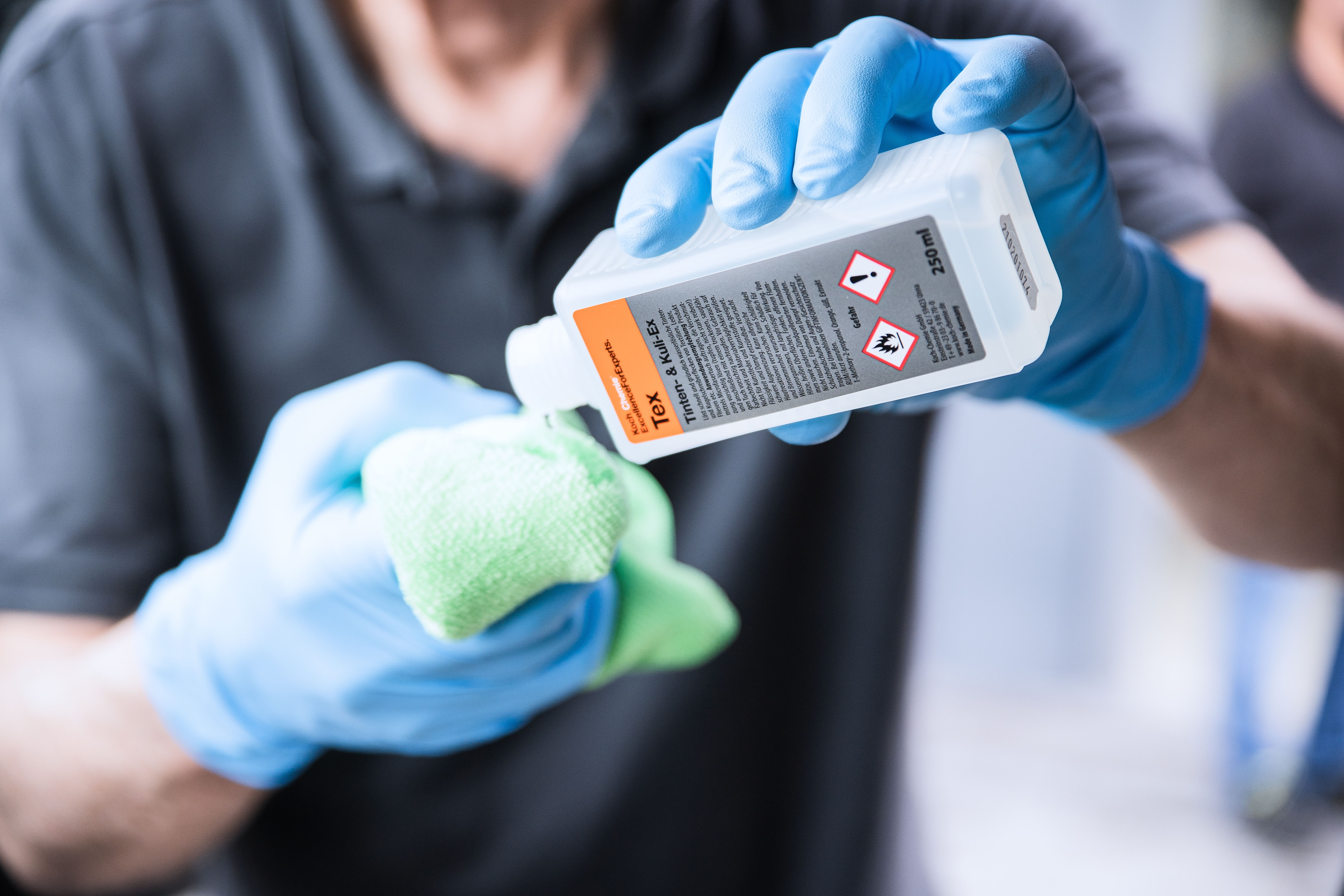 Produkt mittels Microfasertuch auftragen, die Verschmutzung vorsichtig lösen (tupfen, nicht stark reiben!) und anschließend mit einem trockenen, saugfähigen Tuch vorsichtig nachtupfen. Bei starken Verschmutzungen den Vorgang wiederholen. Anschließend großflächig mit geeignetem Reinigungsmittel (z.B. Pol Star) nachbearbeiten.