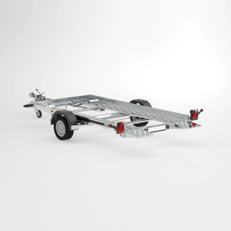 Autotransportanhänger mit kippbarer Lochblech Transportfläche. Räder an der Außenseite der Transportfläche montiert. Gebaut für kleine Fahrzeuge. Möglichkeit des einbaus eines Kurbellifts.